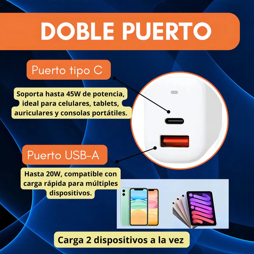 Puerto Tipo-C: Soporta hasta 45W de potencia, ideal para celulares, tablets, auriculares, consolas portátiles y más.