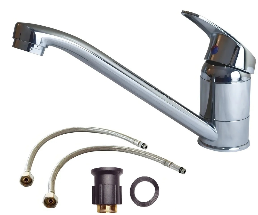 Cuerpo de METAL cromado con excelente terminación Incluye kit de fijación y flexibles de acero inoxidable de 38 cm. Pico giratorio - agua fría y caliente (mezcladora) Aireador espumante. Presentación en caja individual Repuestos universales Peso: 510 grs. Medidas: 24 cm en total. 20 cm del pico. 10 cm de alto. 13 cm alto total del pico. 5 cm de diámetro de conexión cierre cerámico