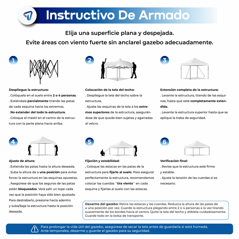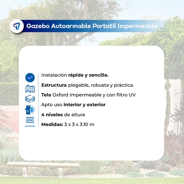 El Gazebo Plegable 3x3 es la solución ideal para eventos al aire libre, ofreciendo protección contra sol y lluvia con un diseño autoarmable de montaje rápido. Su tela impermeable con costuras selladas garantiza resguardo total, mientras que la estructura de acero reforzado proporciona estabilidad en cualquier terreno. Con paredes laterales desmontables, se adapta fácilmente a diferentes necesidades. Disponible en rojo, azul y blanco, combina funcionalidad y estilo. Su bolsa de transporte facilita su traslado. Fabricado en poliéster 420D con revestimiento PVC, cuenta con altura ajustable en cuatro niveles (hasta 310 cm). Su estructura de acero anticorrosión incluye caños de 3x3 cm en el exterior y 1x2 cm en el interior. El peso total es de 21 kg e incluye techo, paredes laterales en un solo tramo, estacas reforzadas, tensores y manual de instrucciones. Diseñado para uso en condiciones climáticas favorables, se recomienda asegurar correctamente la estructura y desmontarlo en caso de tormentas.