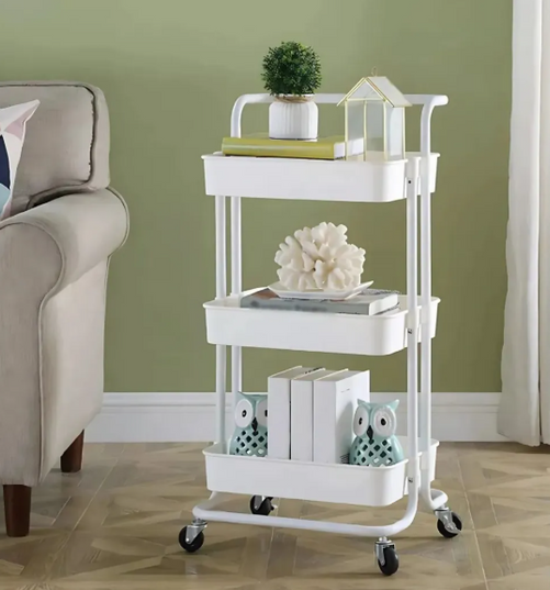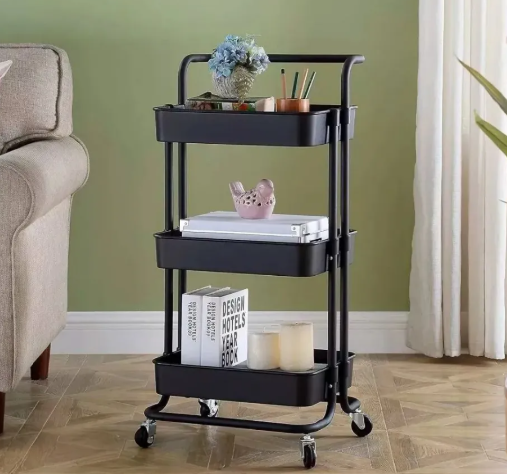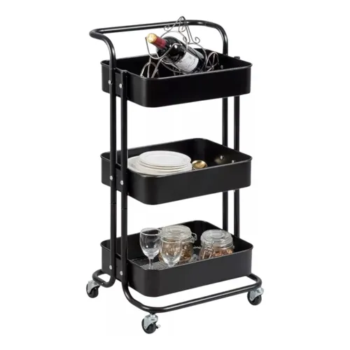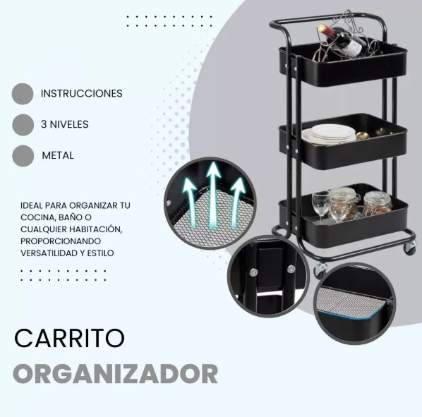 La estructura del carrito está compuesta por un marco metálico resistente con recubrimiento anticorrosivo, lo que garantiza su longevidad y lo protege del desgaste diario. Sus tres niveles de almacenamiento permiten distribuir los objetos de forma ordenada, aprovechando al máximo cada bandeja. Las superficies de cada nivel cuentan con bordes elevados que evitan la caída accidental de los objetos al mover el carrito, ofreciendo una mayor seguridad y estabilidad.