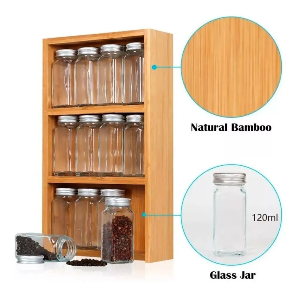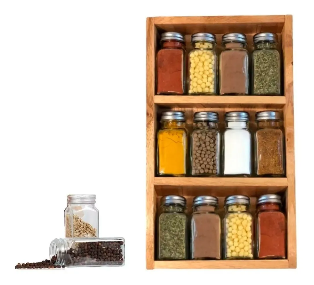 SET X12 PIMENTEROS ESPECIEROS CONDIMENTEROS DE VIDRIO CON TAPA DE ACERO + ESTANTE REPISA DE MADERA LAQUEADA-