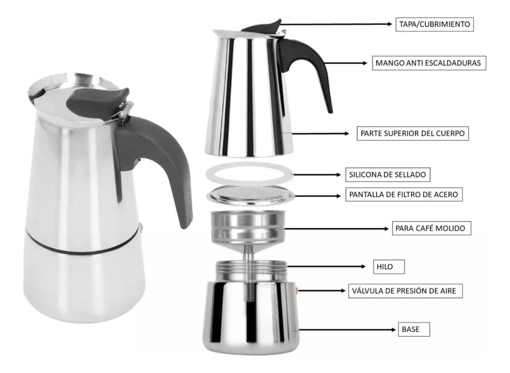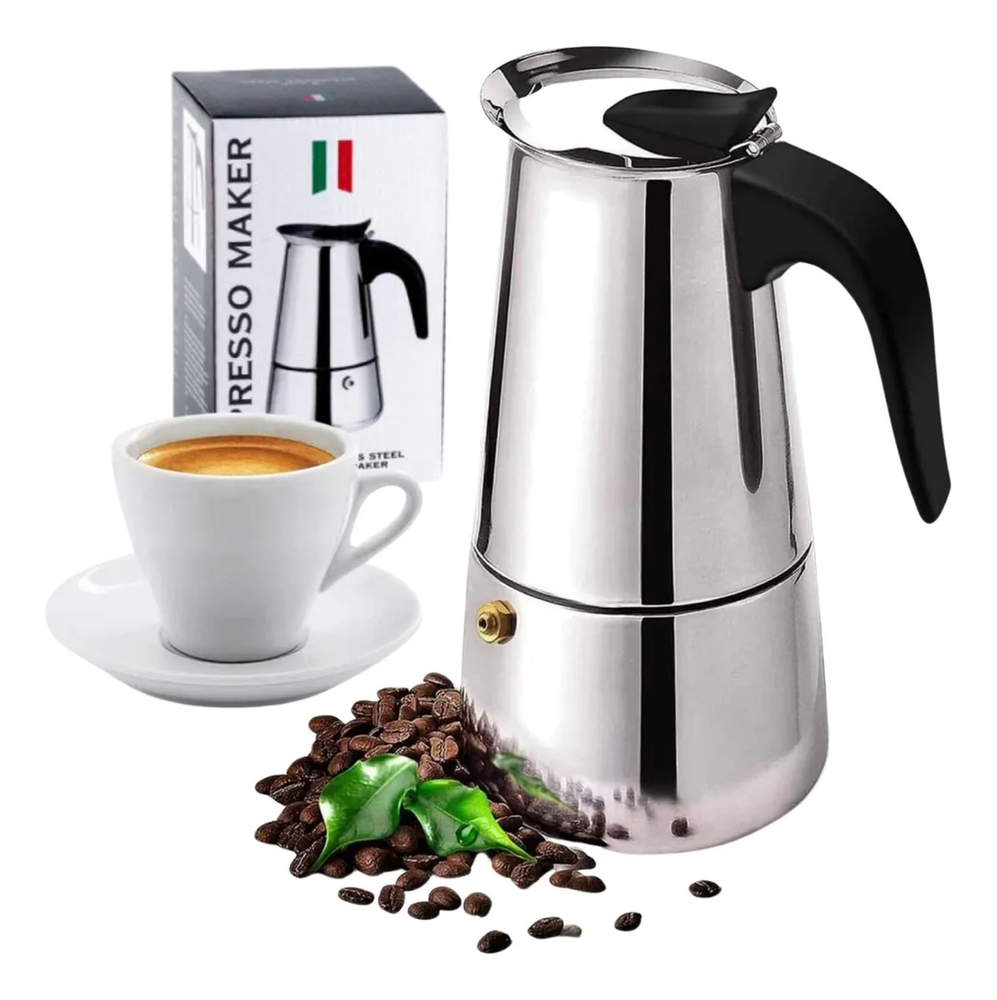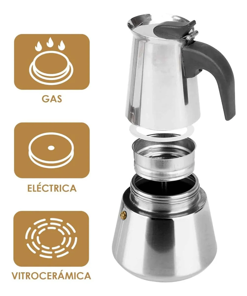 Fabricada en acero inoxidable, esta cafetera es resistente y duradera, garantizando un uso prolongado. Su capacidad de 300 mL te permitirá preparar hasta 6 tazas de café de 50ml cada una, ideal para compartir con familiares y amigos.