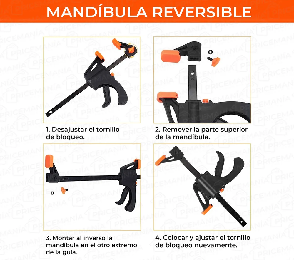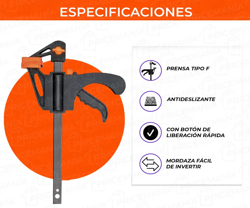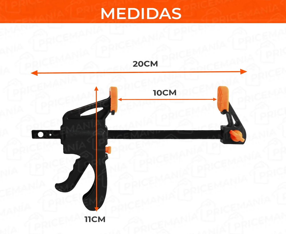 ESPECIFICACIONES: •Medidas: -Alto total: 20cm -Ancho: 11cm -Amplitud total: 10cm •Prensa tipo F •Almohadilla antideslizante que evita cualquier movimiento durante el trabajo a la vez que cuida la superficie en la que es aplicada la prensa. •Fácil y cómodo de usar •Botón de liberación rápida: presiona el botón de liberación rápida de la abrazadera de carpintería y desliza las mandíbulas libremente a cualquier posición. •Ideal para carpintería •Material: metal y ABS