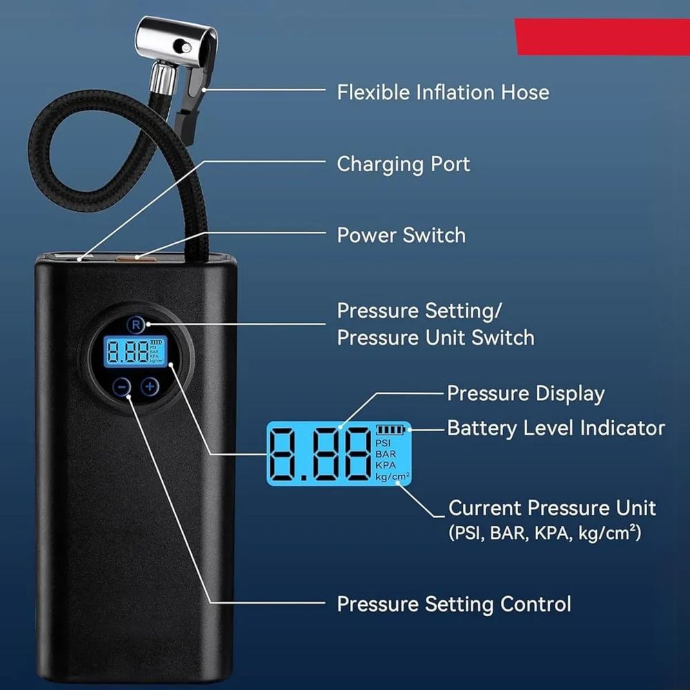 Este inflador portátil eléctrico es una solución práctica y eficiente para inflar neumáticos de auto, moto, bicicleta, pelotas y objetos inflables en cuestión de minutos. Su diseño compacto y liviano lo hace ideal para llevar en el baúl del auto, en la mochila o tener siempre a mano en casa. Cuenta con una pantalla digital LED que muestra la presión actual y permite seleccionar entre varias unidades de medida como PSI, BAR, KPA o kg/cm², además de indicar el nivel de batería. La batería interna es recargable mediante cable USB, lo que permite usarlo sin cables donde sea que lo necesites. Se conecta fácilmente gracias a su manguera flexible y boquilla estándar, y se apaga automáticamente al alcanzar la presión deseada para mayor seguridad. Incluye tres boquillas adaptadoras para diferentes usos, como pelotas deportivas, bicicletas o inflables, además de una aguja metálica para pelotas y el cable de carga. Es un producto práctico, versátil y muy fácil de usar, pensado para quienes buscan comodidad, precisión y portabilidad en un solo dispositivo.