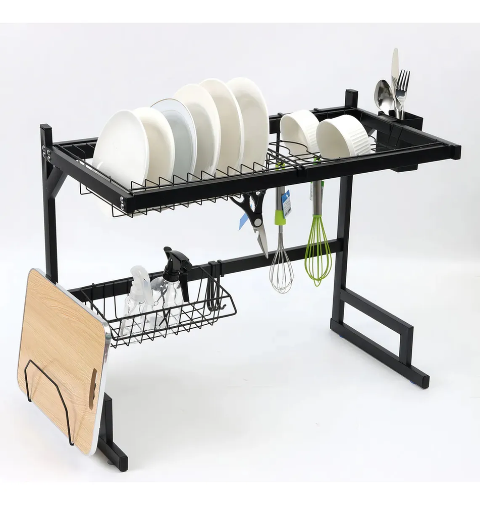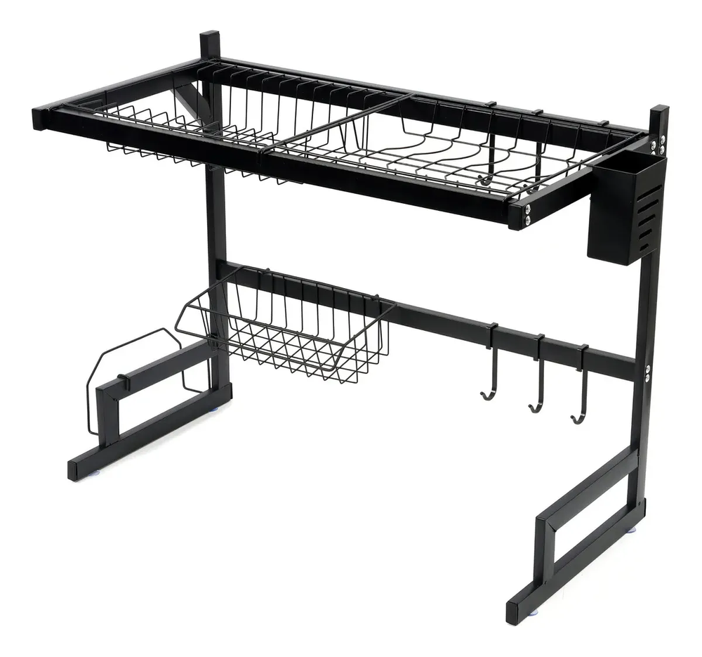 Su diseño sobre lavaplatos optimiza el espacio y facilita el drenaje directo. Fabricado en acero inoxidable negro mate, es resistente a la corrosión y de gran capacidad. Incluye compartimentos específicos para platos, cubiertos, cuchillos y más. Montaje rápido y estructura estable con ventosas antideslizantes. Capacidad: Soporta hasta 20 kg de utensilios. Peso: Aproximadamente 2,5 kg.