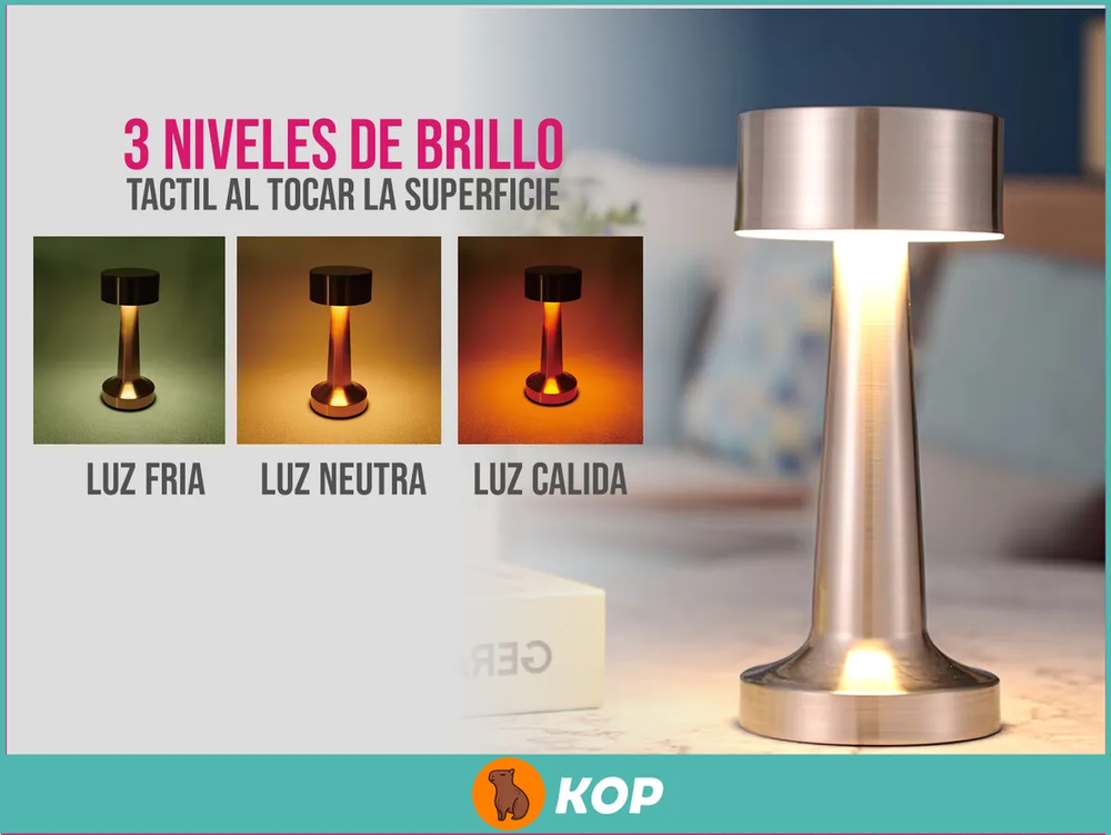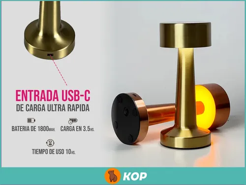 Lámpara velador LED recargable USB táctil de metal con dimmer.