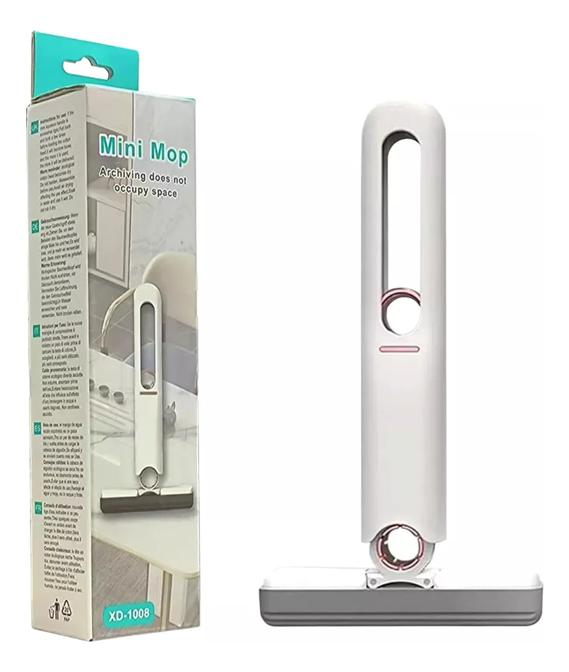 Mini mopa autoapretar: El limpiador de escritorio Mini Mop se puede utilizar tanto para limpieza en húmedo como en seco, y su diseño push-pull tipo anillo permite un lavado y deshidratación fáciles. Con un simple pliegue por la mitad y un tirón y apretón con una sola mano, puede eliminar rápida y fácilmente las manchas de agua de cualquier superficie. Este sistema de fregona plana y cubo es perfecto para suministros de limpieza de cocina.