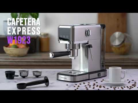 Cafetera express de 19 BAR de presión. Bomba Italiana. Espumador de leche. Filtro para una o dos tazas. Apta para cápsulas tipo Nespresso. Botón de vapor. Bandeja antigoteo. Pantalla LCD. Bandeja superior calienta tazas. Potencia 1350 W.
