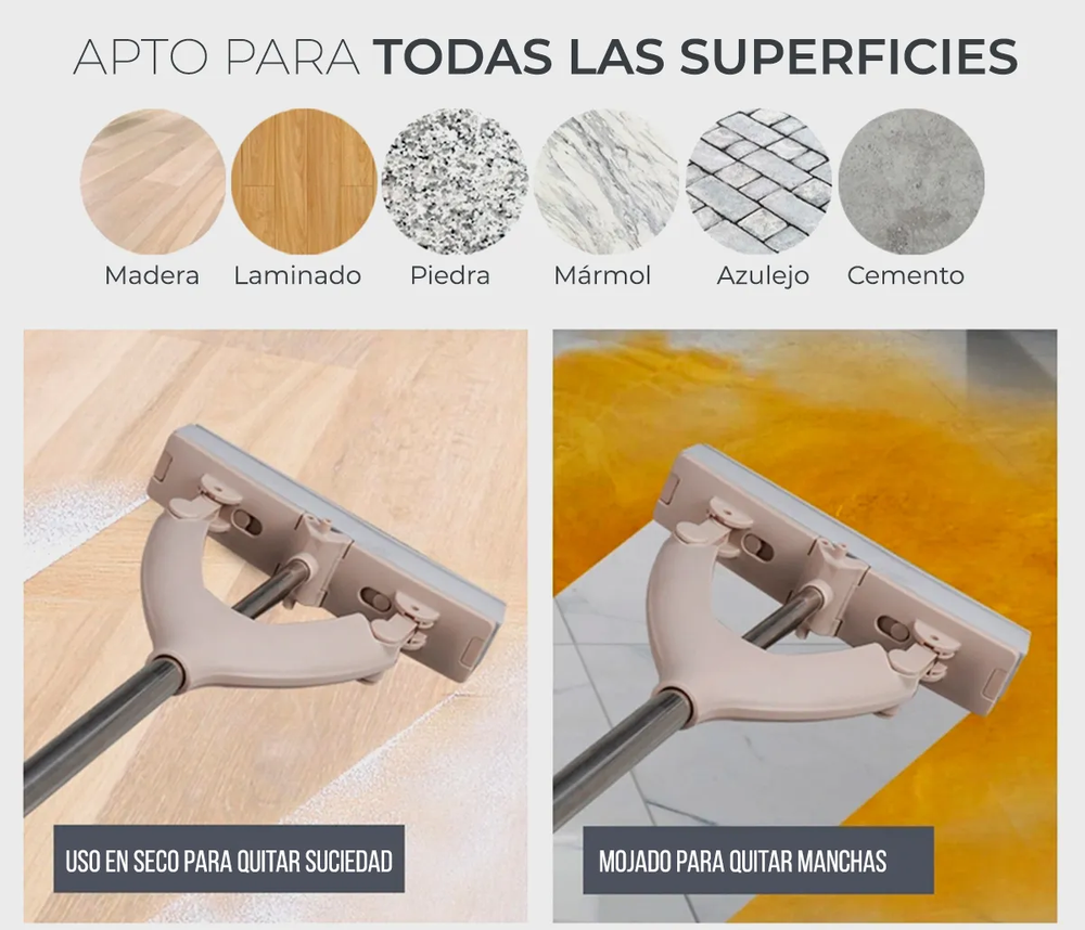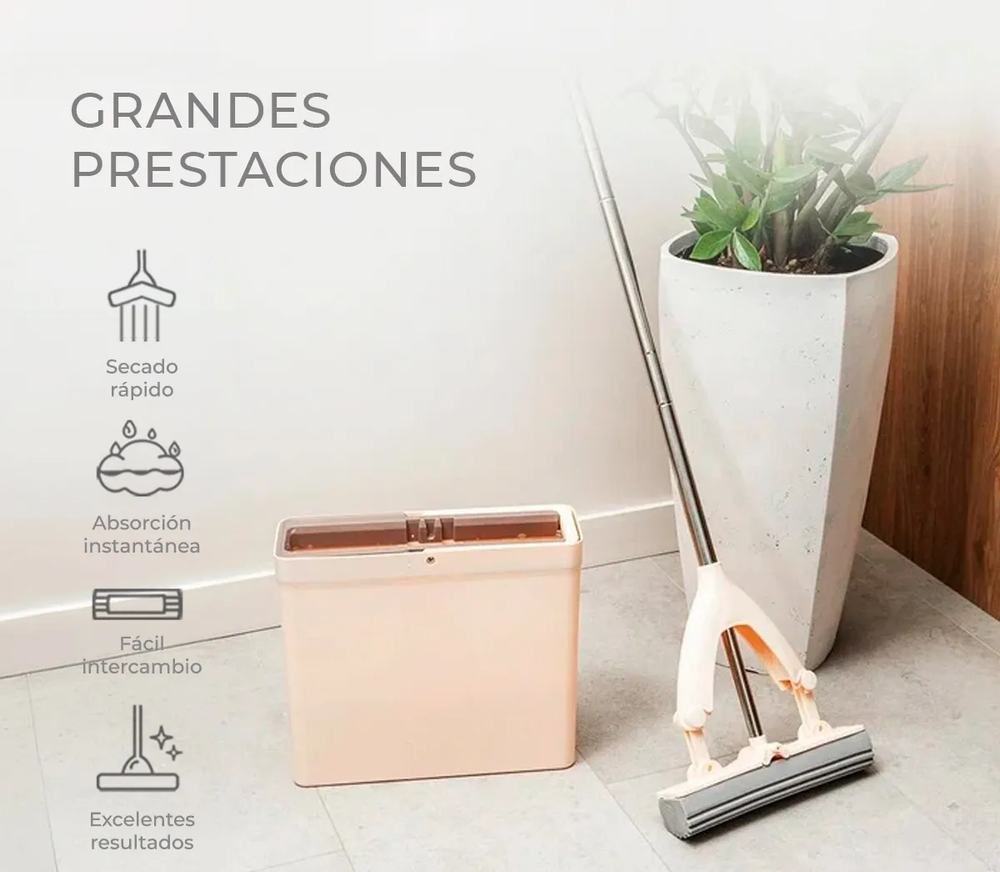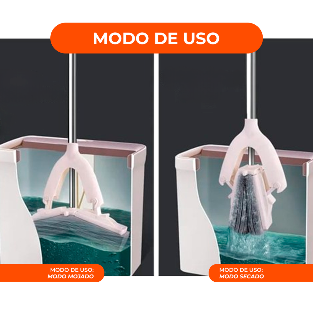 • Longitud ajustable: El palo de la mopa se puede ajustar para adaptarse a diferentes alturas y necesidades. • Sistema de escurrido automático: Con un simple movimiento en el cubo, podrás escurrir la mopa y eliminar el exceso de agua sin necesidad de usar las manos. • Fácil de usar y almacenar: El balde mopa es fácil de montar, desmontar y limpiar. • Uso en seco o húmedo: La mopa es ideal para limpiar tanto superficies secas como húmedas.