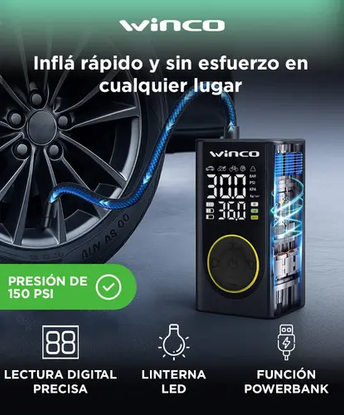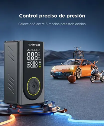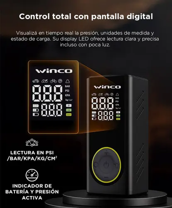 Diseño portátil y resistente: Con dimensiones de 12,4 × 7,4 × 5,5 cm, el compresor de aire Winco es liviano, ergonómico y fácil de transportar. Su estructura sólida permite guardarlo en la guantera, mochila o kit de herramientas, listo para acompañarte en cualquier trayecto.