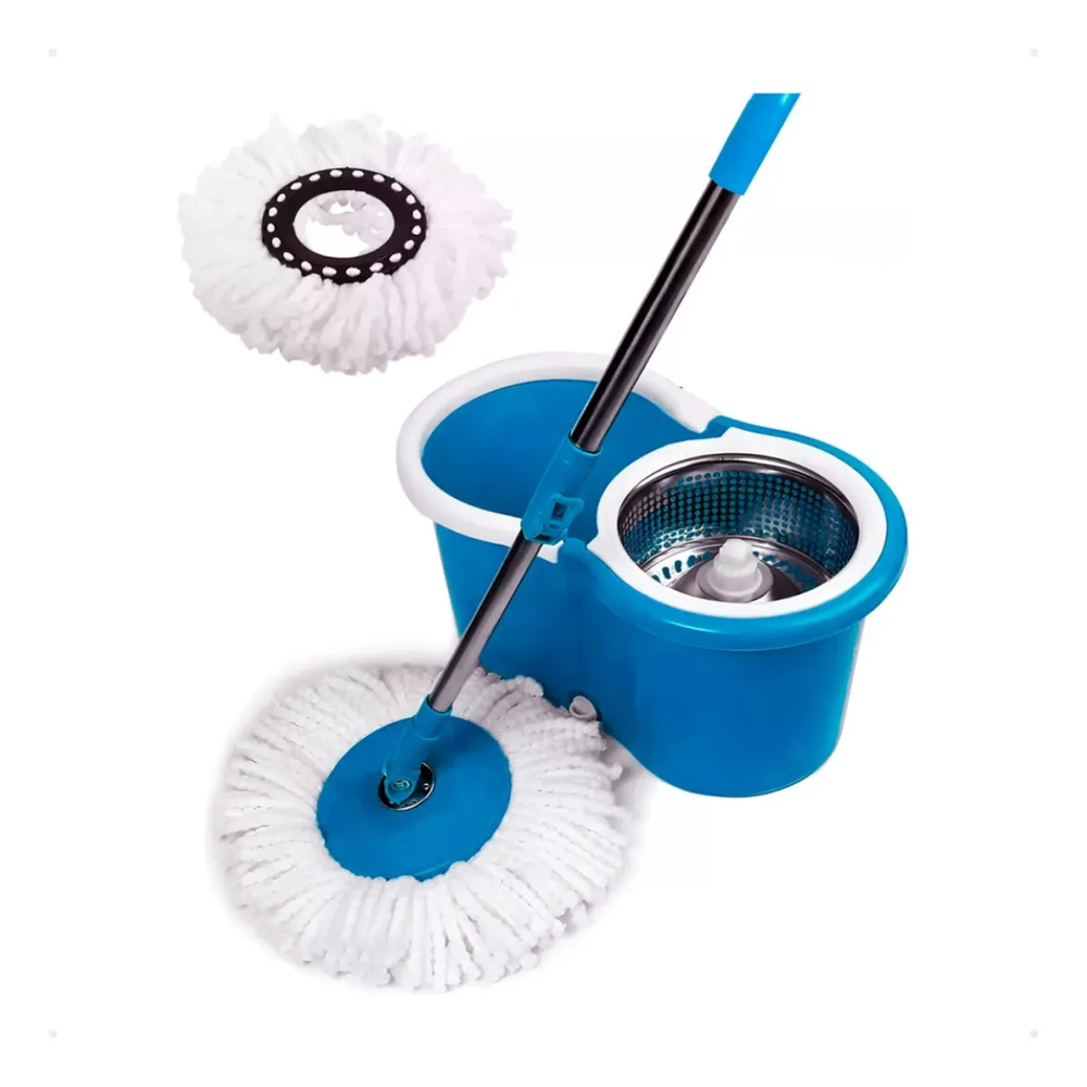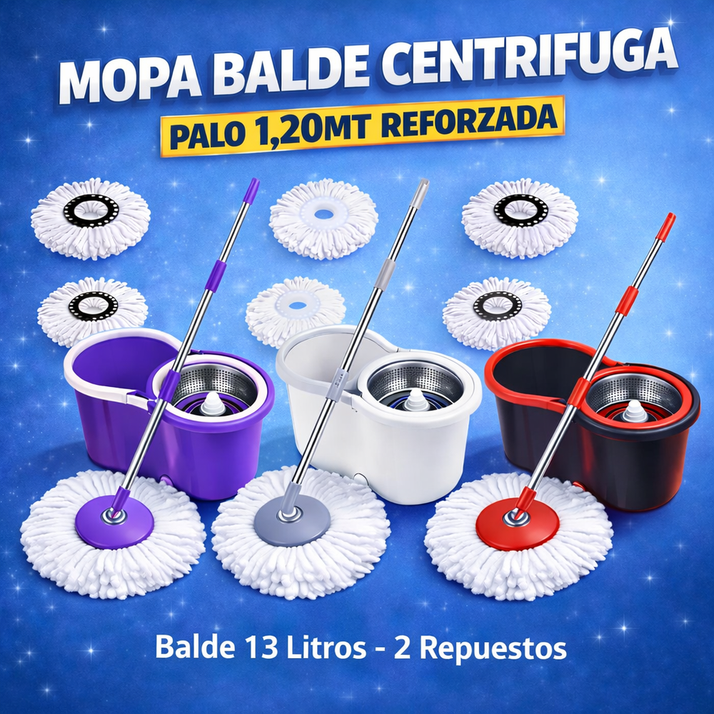 Con mango regulable: Sí Con cabezal giratorio del lampazo de limpieza: Sí Con rotación de 360 grados: Sí Incluye lampazo de repuesto: Sí Incluye balde centrifugador: Sí Cantidad de paños: 2 superabsorbentes de calidad Dispenser para Jabon: no Ruedas: Si Medidas balde: 26cm x 46cm x 23cm Medida de bastón: 120cm de largo Tipo de centrifugado: Por presión en el palo Capacidad: 13 Litros Repuestos de Mopa: Universales