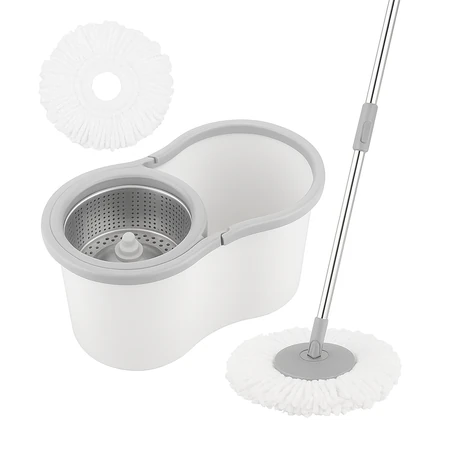 Con mango regulable: Sí Con cabezal giratorio del lampazo de limpieza: Sí Con rotación de 360 grados: Sí Incluye lampazo de repuesto: Sí Incluye balde centrifugador: Sí Cantidad de paños: 2 superabsorbentes de calidad Dispenser para Jabon: no Ruedas: Si Medidas balde: 26cm x 46cm x 23cm Medida de bastón: 120cm de largo Tipo de centrifugado: Por presión en el palo Capacidad: 13 Litros Repuestos de Mopa: Universales