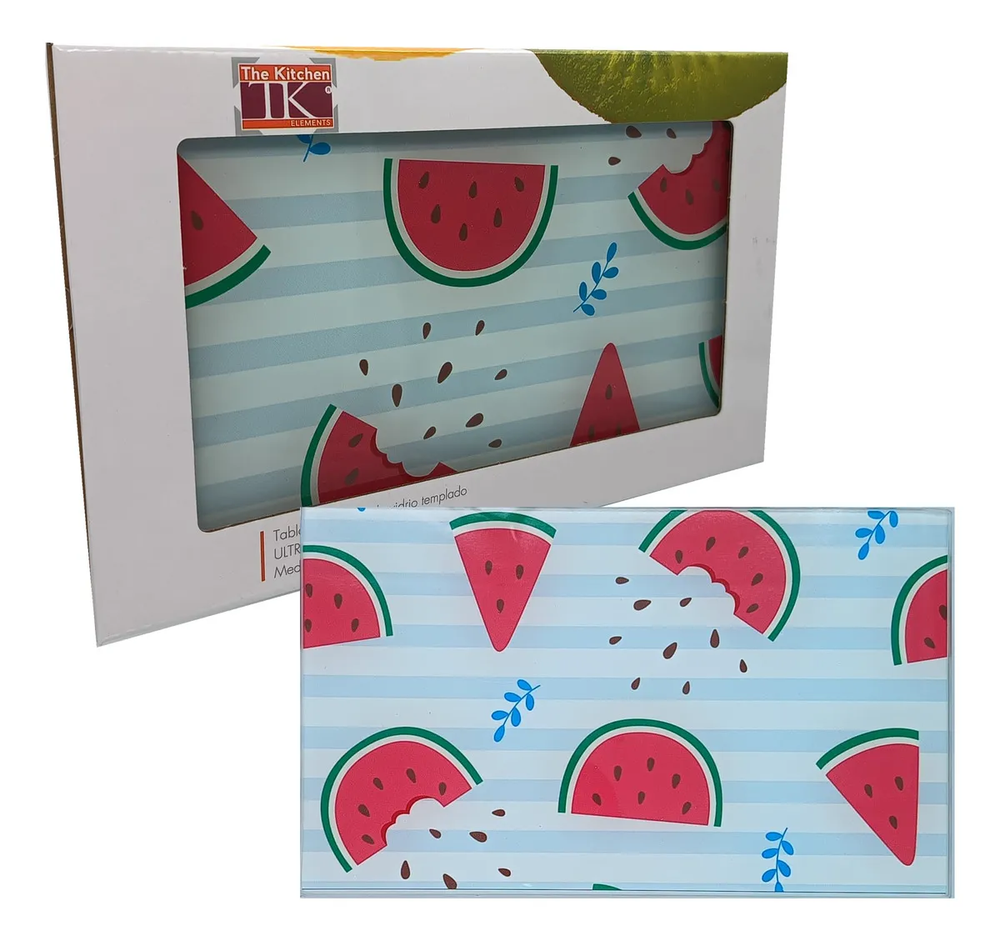 Descubre la versatilidad y elegancia de la Tabla Decorativa de Vidrio Templado 25x15cm modelo Sandía, ideal para picar y cortar todo tipo de alimentos. Su diseño rectangular y su espesor de 1 mm garantizan durabilidad y resistencia. Gracias a su material de vidrio templado, esta tabla no solo es más limpia e higiénica que las de madera o plástico, sino que también resiste al calor, lo que la convierte en una opción segura para tu cocina. Además, cuenta con 4 topetinas de silicona antideslizantes que aseguran estabilidad durante su uso. Aunque no es apta para lavavajillas, su fácil limpieza a mano la hace práctica y funcional. Con un diseño atractivo y moderno, esta tabla es perfecta para quienes buscan combinar estilo y funcionalidad en su hogar.