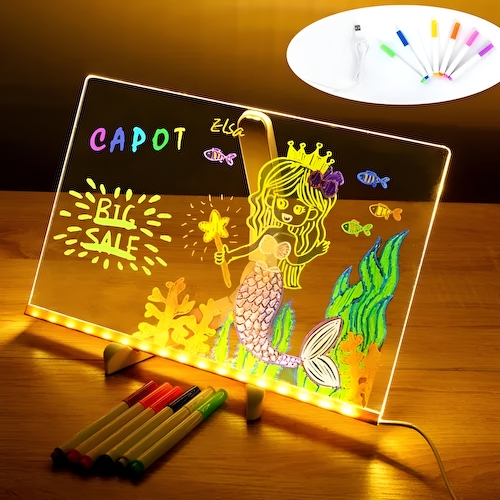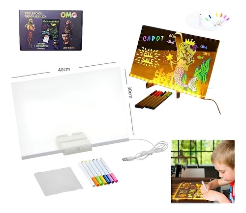 ¡Haz que tus ideas cobren vida con luz propia! Esta innovadora pizarra acrílica con iluminación LED es la herramienta perfecta para estimular la creatividad de niños y adultos. Ideal para dejar mensajes, dibujar, planificar o decorar cualquier espacio con un toque moderno y divertido.