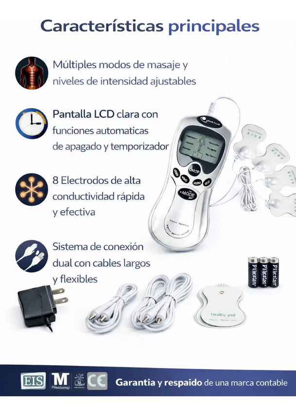 Configuración: Posee 4 canales de salida, lo que permite utilizar hasta 8 electrodos (parches) simultáneamente para cubrir áreas grandes del cuerpo.
