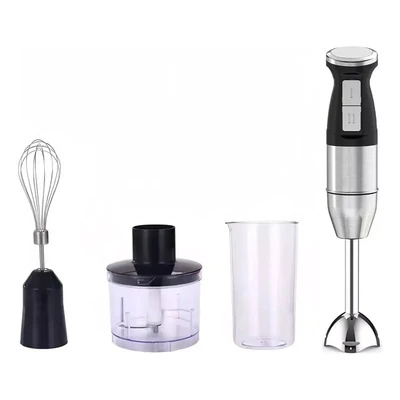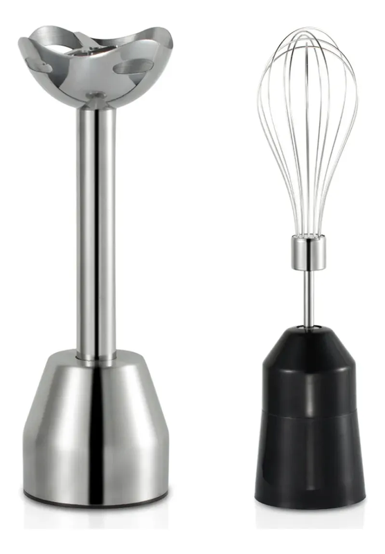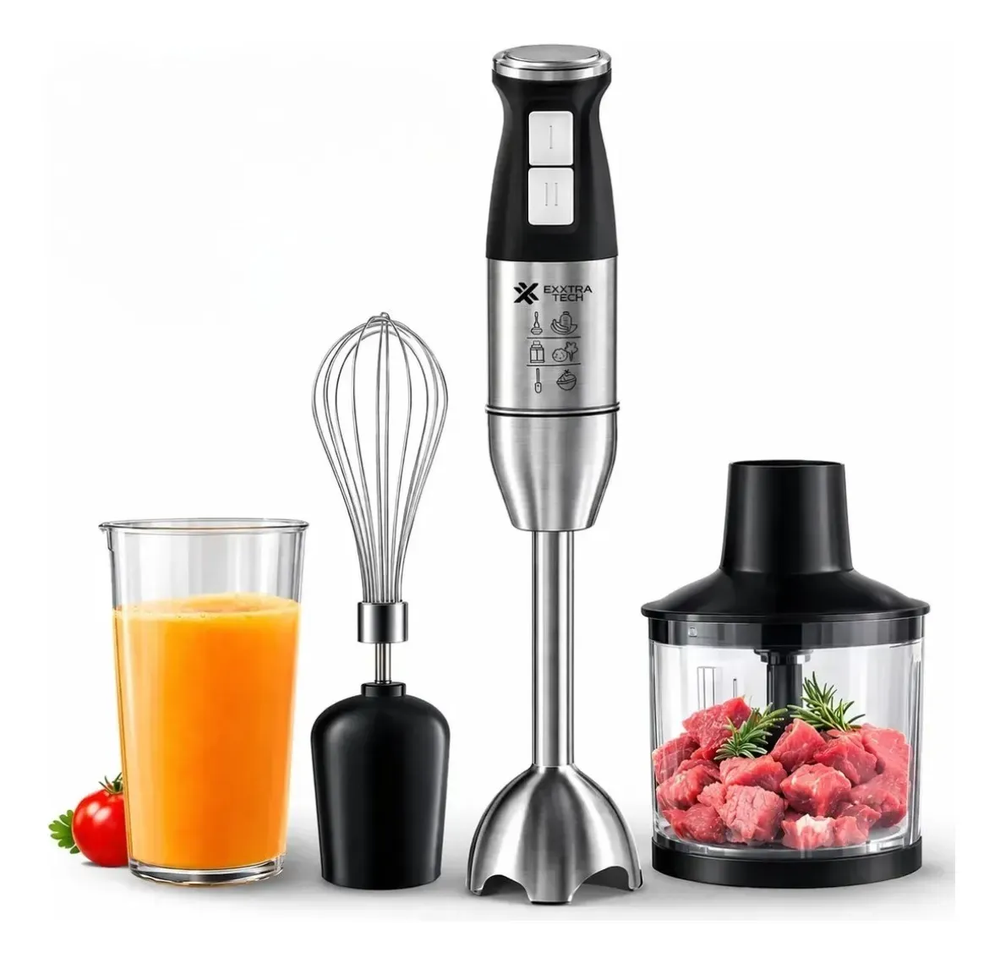 El kit multifunción incluye batidor, brazo licuador, picador y vaso medidor para realizar diversas recetas en un equipo.